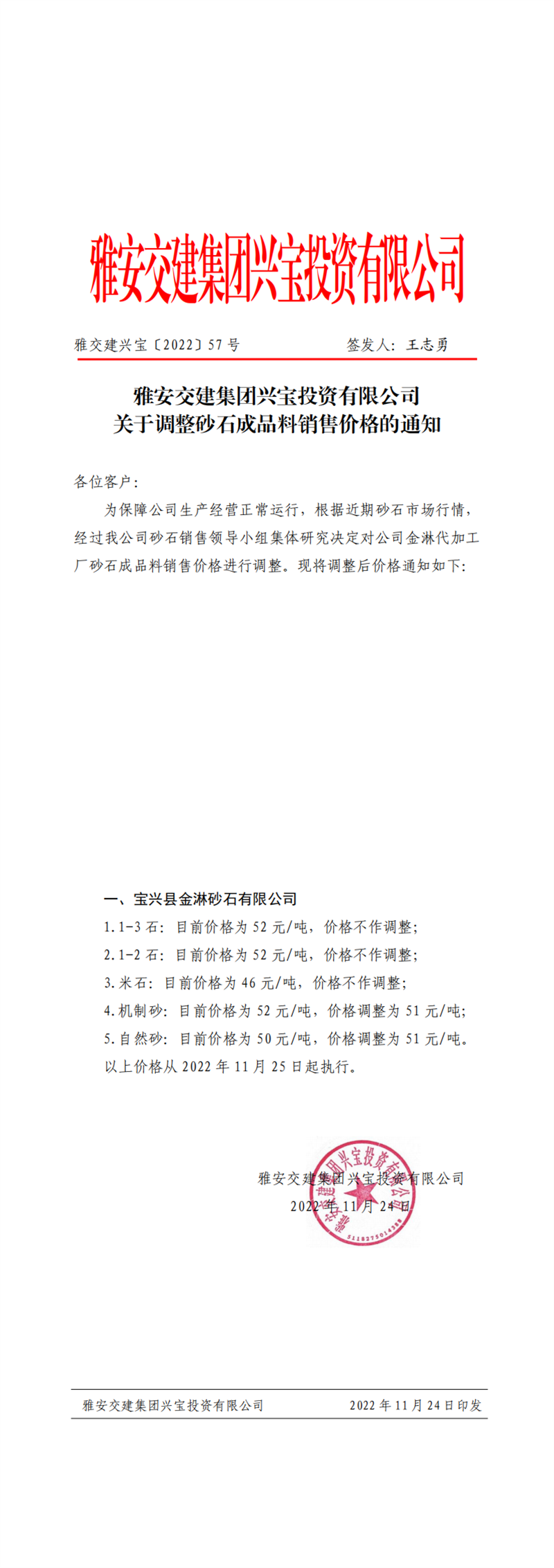 雅交建兴宝〔2022〕57号 关于调整砂石成品料销售价格的通知--11.24