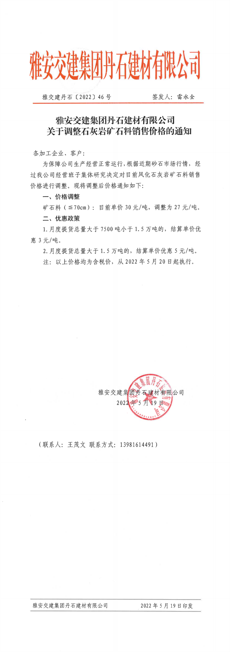 威廉希尔集团丹石公司关于调整石灰岩矿石料价格的通知-2022-5-19