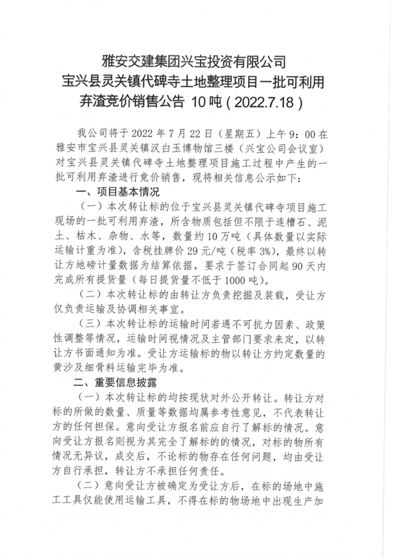 宝兴县灵关镇代碑寺土地整理项目一批可利用弃渣竞价销售公告7.18(5万吨)