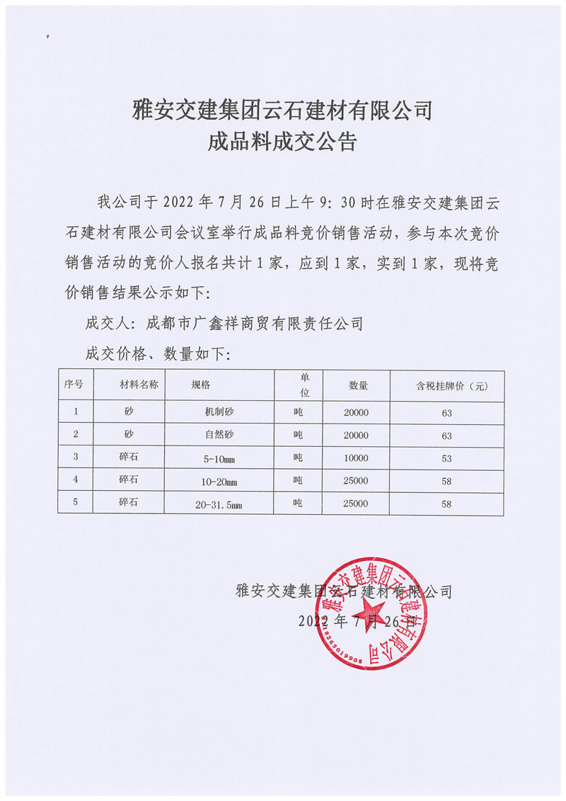 威廉希尔集团云石建材有限公司成品料竞价销售成交公告7.26