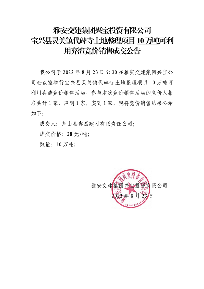 威廉希尔集团兴宝投资有限公司宝兴县灵关镇代碑寺土地整理项目10万吨可利用弃渣竞价销售成交公告(8.23)