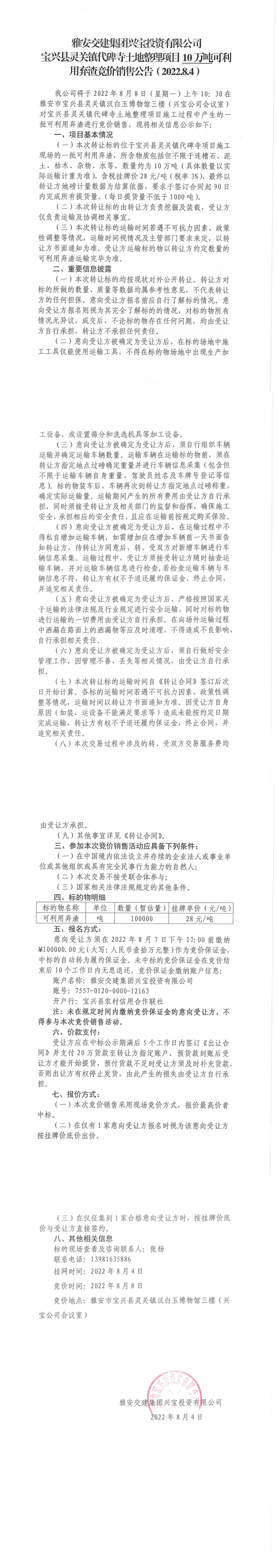 威廉希尔集团兴宝投资有限公司灵关镇代碑寺土地整理项目10万吨可利用弃渣竞价销售公告(2022.8.4)