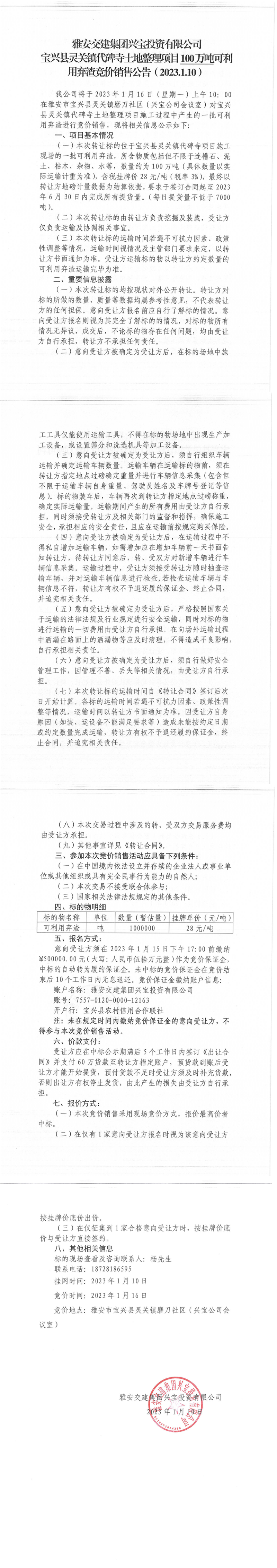 威廉希尔集团兴宝投资有限公司灵关镇代碑寺土地整理项目100万吨可利用弃渣竞价销售公告(2023.1.10)