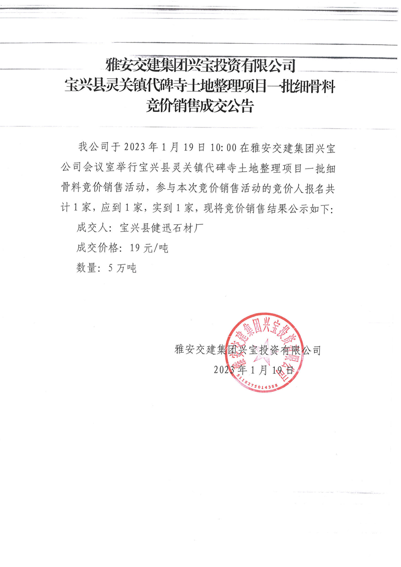 威廉希尔集团兴宝投资有限公司代碑寺土地整理项目细骨料竞价销售成交公告(2023.1.19)