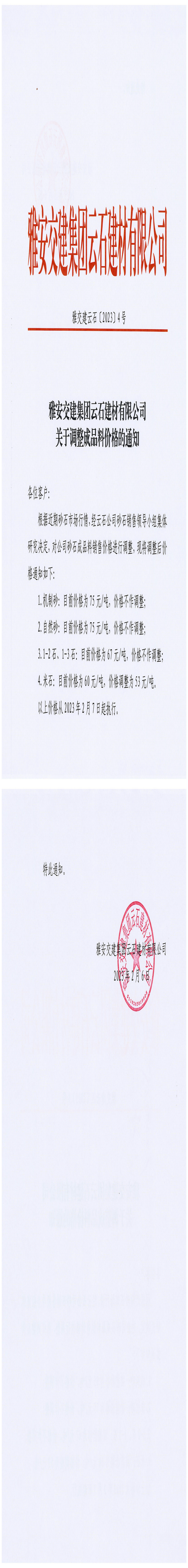 威廉希尔集团云石建材有限公司关于调整成品料价格的通知-2023-02-06